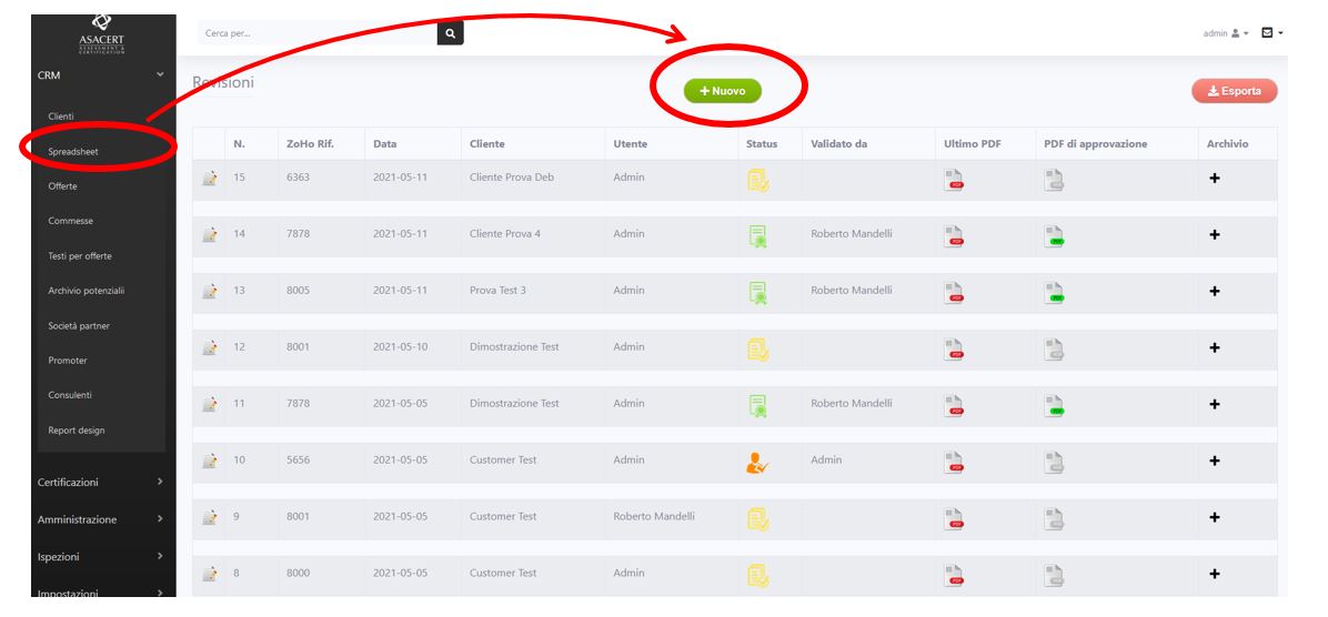 Nella sezione CRM, cliccare sulla voce Spreadsheet e poi sul pulsante “+Nuovo”.