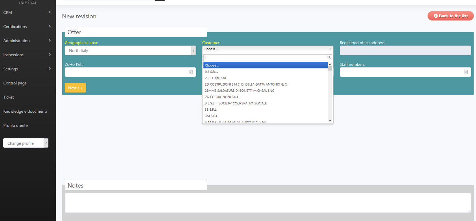 Nel campo Zoho Ref al momento va inserito il numero del potenziale da generare sul CRM, in futuro sarà automatico, generato da MyAsacert.