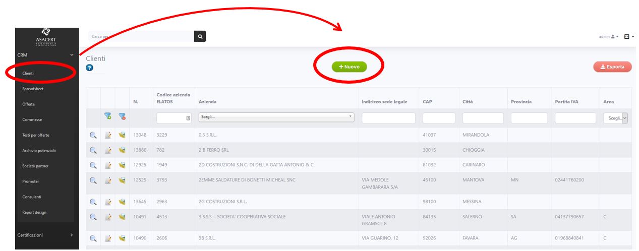 Nella sezione CRM, cliccare sulla voce di menu Clienti e cliccare sul tasto Nuovo.