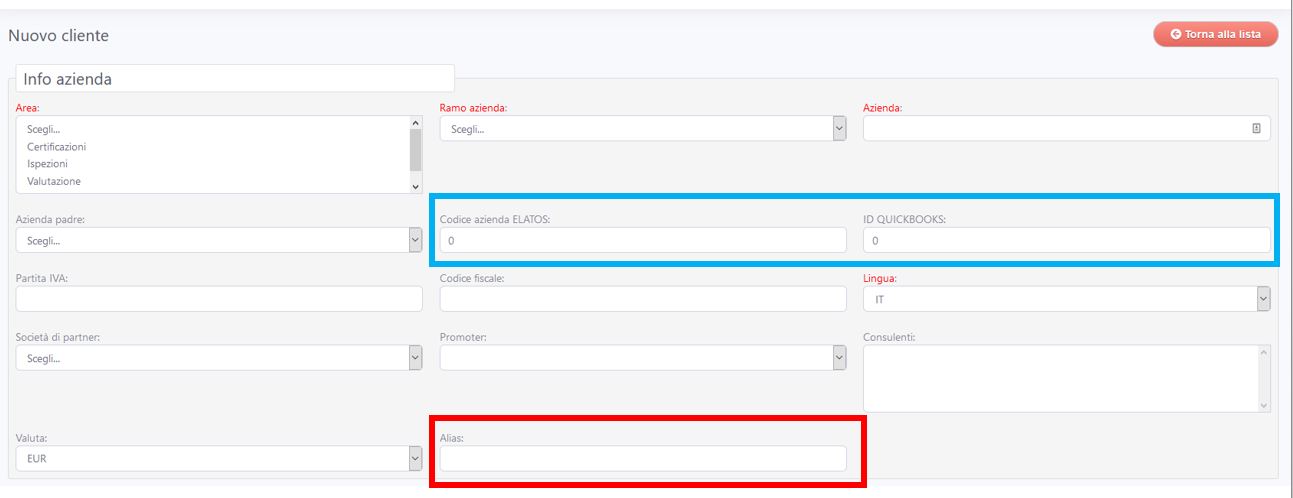 Il codice di Elatos o di Quickbook sono da inserire in futuro, quando il cliente sarà inserito in uno dei due sistemi, per la fatturazione.