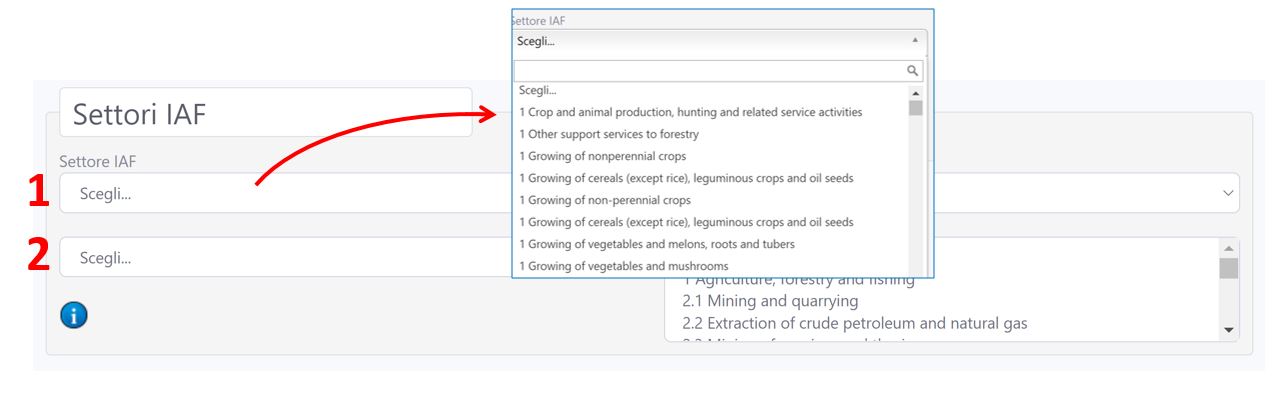 È necessario assegnare uno o più settori di attività al cliente. Per farlo si può cercare una parola chiave nella casella 1, il sistema farà una ricerca all’interna del NACE e mostrerà nella casella 2 una serie di opzioni tra cui scegliere.