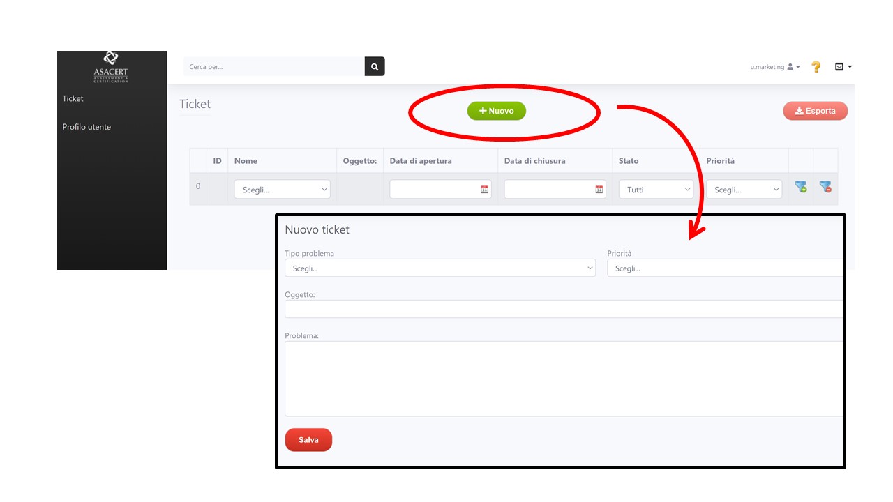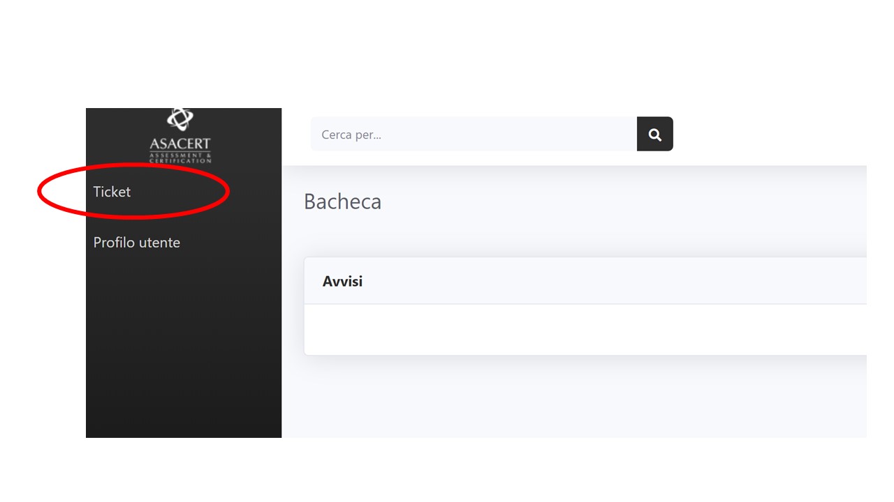 Per aprire un ticket è necessario loggarsi al proprio profilo MyAsacert e cliccare sulla voce Ticket nel menu laterale.