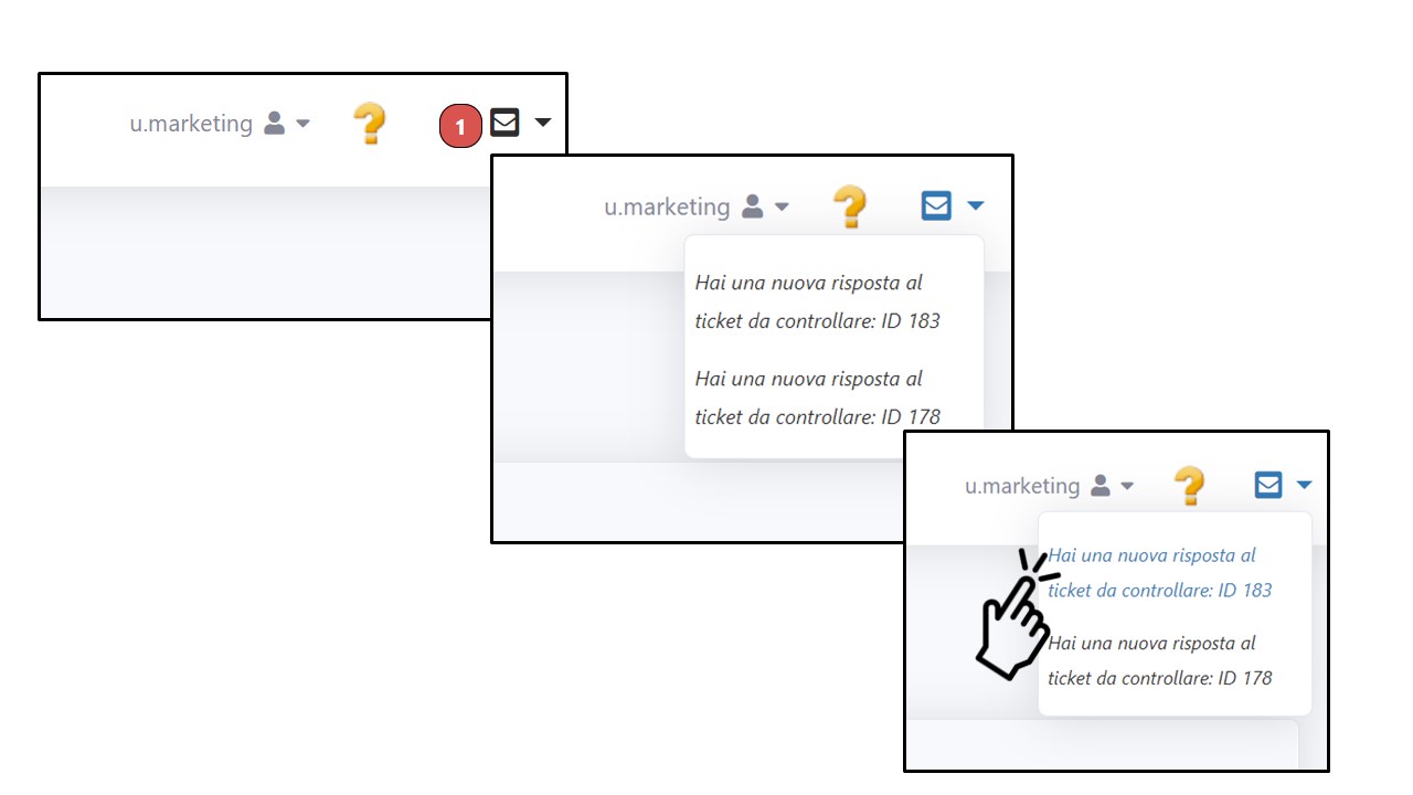 Il personale addetto all’assistenza tecnica vi risponderà attraverso il portale. Riceverete una notifica all’interno del sistema, in alto a destra, e potrete cliccarla per aprirla.