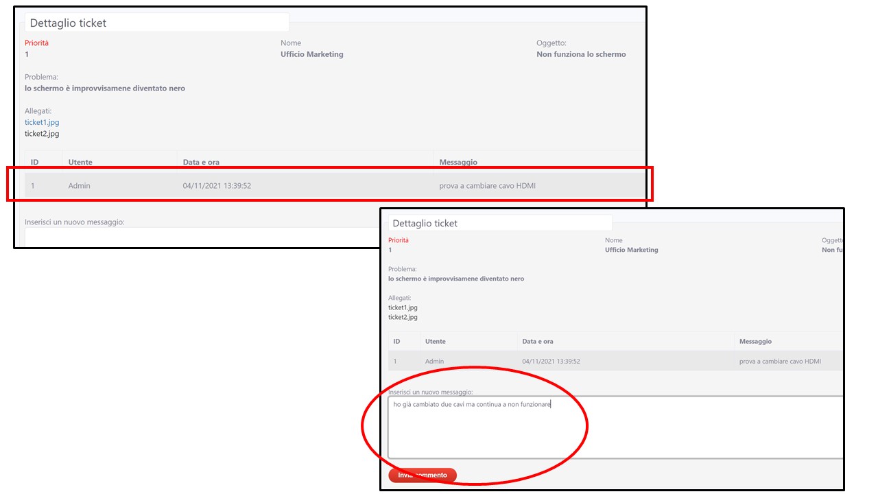All’interno del ticket sarà quindi possibile leggere la risposta ricevuta e rispondere a vostra volta, come mostrato nella figura.